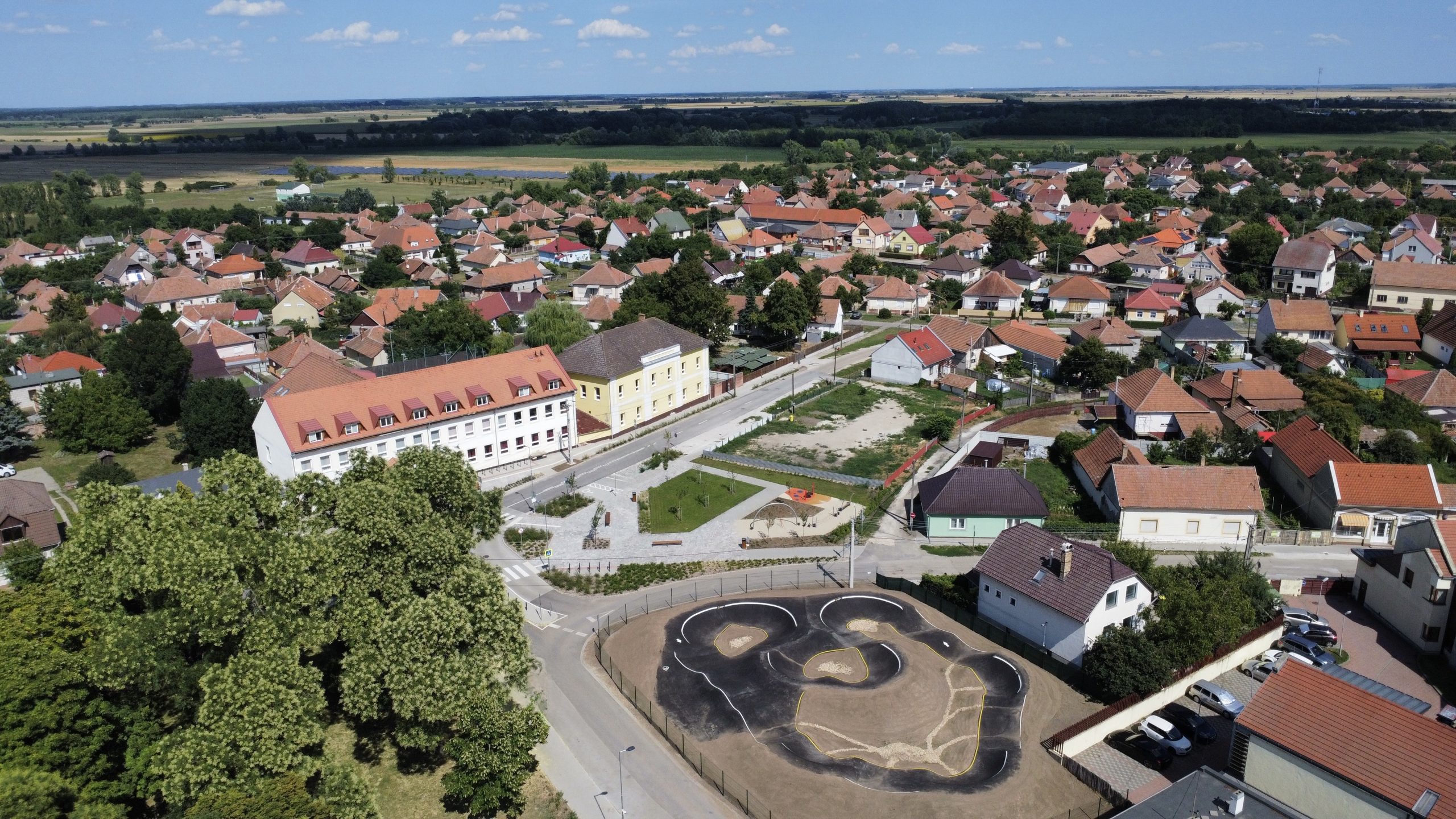 2025 júliusában adtuk át Polgár városközpontjában a legújabb pumpapályánkat, amelynek kivitelezése különleges kihívást jelentett számunkra. A rendelkezésre álló terület rendkívül szűkös volt, ennek ellenére sikerült 430 négyzetméter aszfaltozott felületet és 125 méter nyomvonalhosszt kialakítanunk. A projekt precíz tervezést és kreatív megoldásokat igényelt, hogy a helyszín adottságaihoz igazodva egy minden igényt kielégítő sportlétesítményt hozzunk létre.